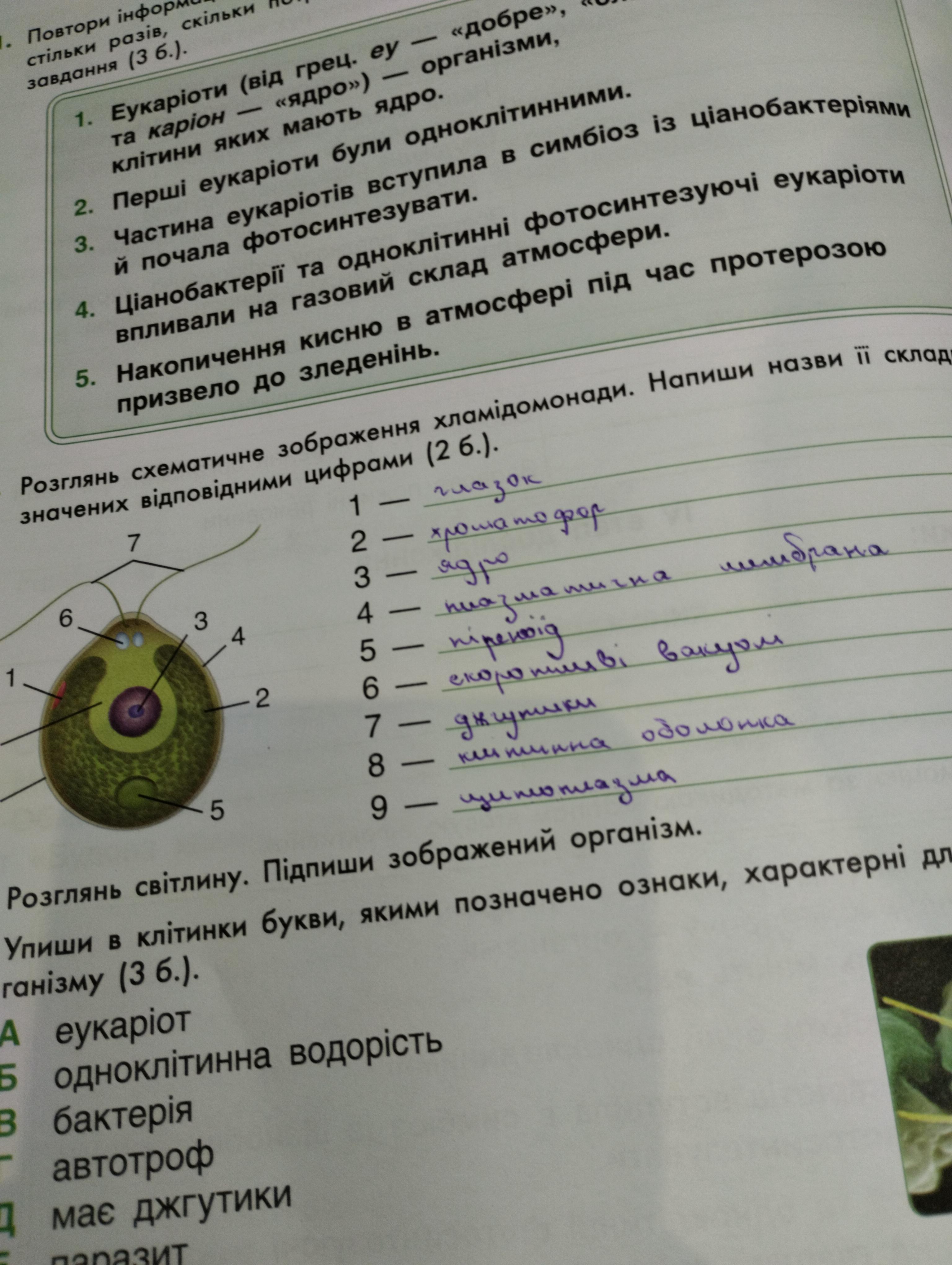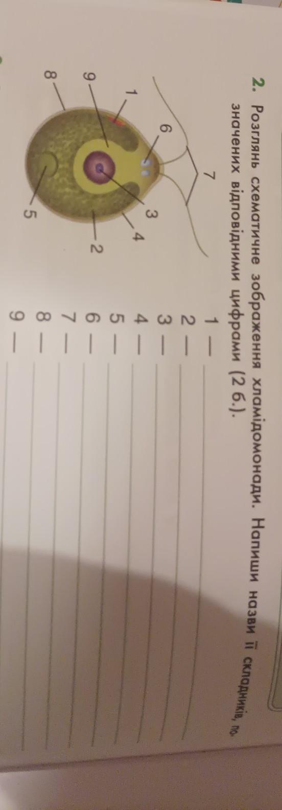 9 8 2. Розглянь схематичне зображення хламідомонади. Напиши назви її ск значених відповідними цифрами (2 б.). 1 2 6 7 З 5 2 5678AWN- 3 4все на рисунку