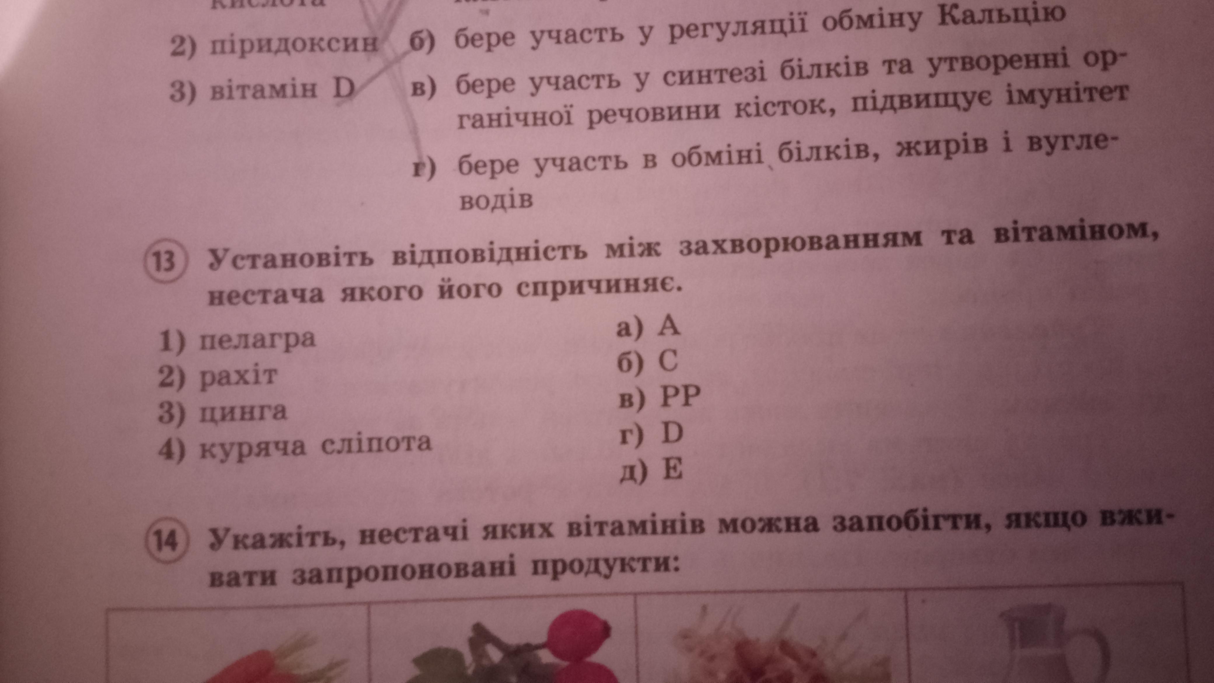 Установіть відповідність між захворюванням та вітаміном, нестача якого його спричиняє. 1)пелагра 2)рахіт 3)цинга 4)куряча сліпота а)А б)C в)PP г)D д)E