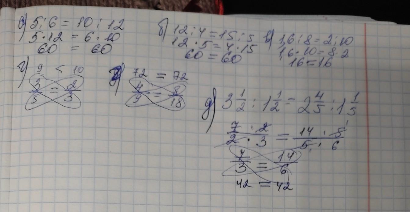 Використовуючи основну властивість пропорції, перевір, чи правильна пропорція a) 5:6 = 10:12; б) 12:4=15:5 в)1,6:8=2:10 г) 3/5=2/3 ґ)4/9=8/18 д) 3 1/2: 1 1/2=2 4/5: 1 1/5
