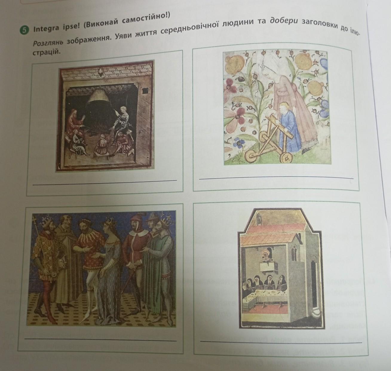 5 Integra ipse! (Виконай самостійно!) Розглянь зображення. Уяви життя середньовічної людини та добери заголовки до ілюстрацій.