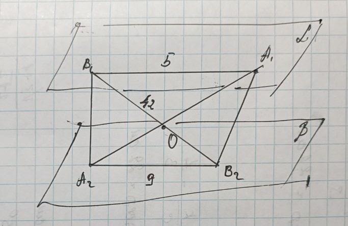 Через точку O, що лежить між двома паралельними площинами а і β, проведено дві прямі a і b. Пряма a перетинає площини а і β в точках A1 і A2, а пряма b — у точках B1 і B2 відповідно. Знайди OB1, якщо B1B2 = 42 см, A1B1 = 5 см, A2B2 = 9 см