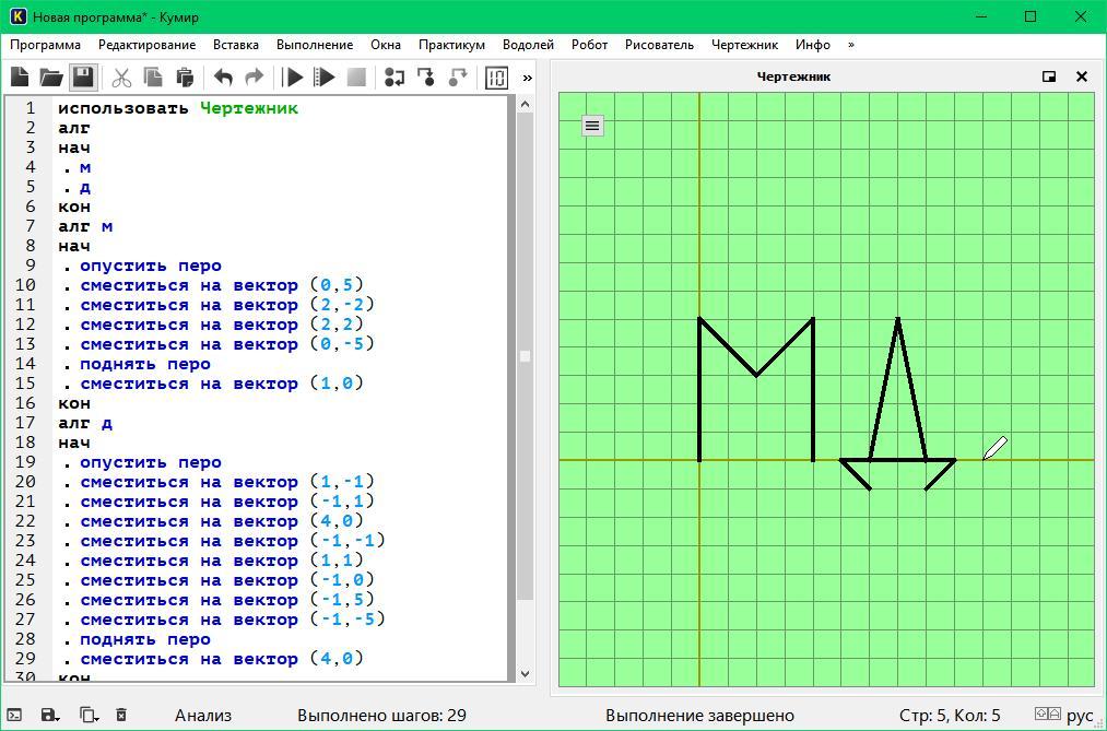 Разработайте алгоритмы для изображения букв М и Д в среде графического исполнителя Чертёжник системы КуМир. Завершить выполнение алгоритма можно в любой точке.