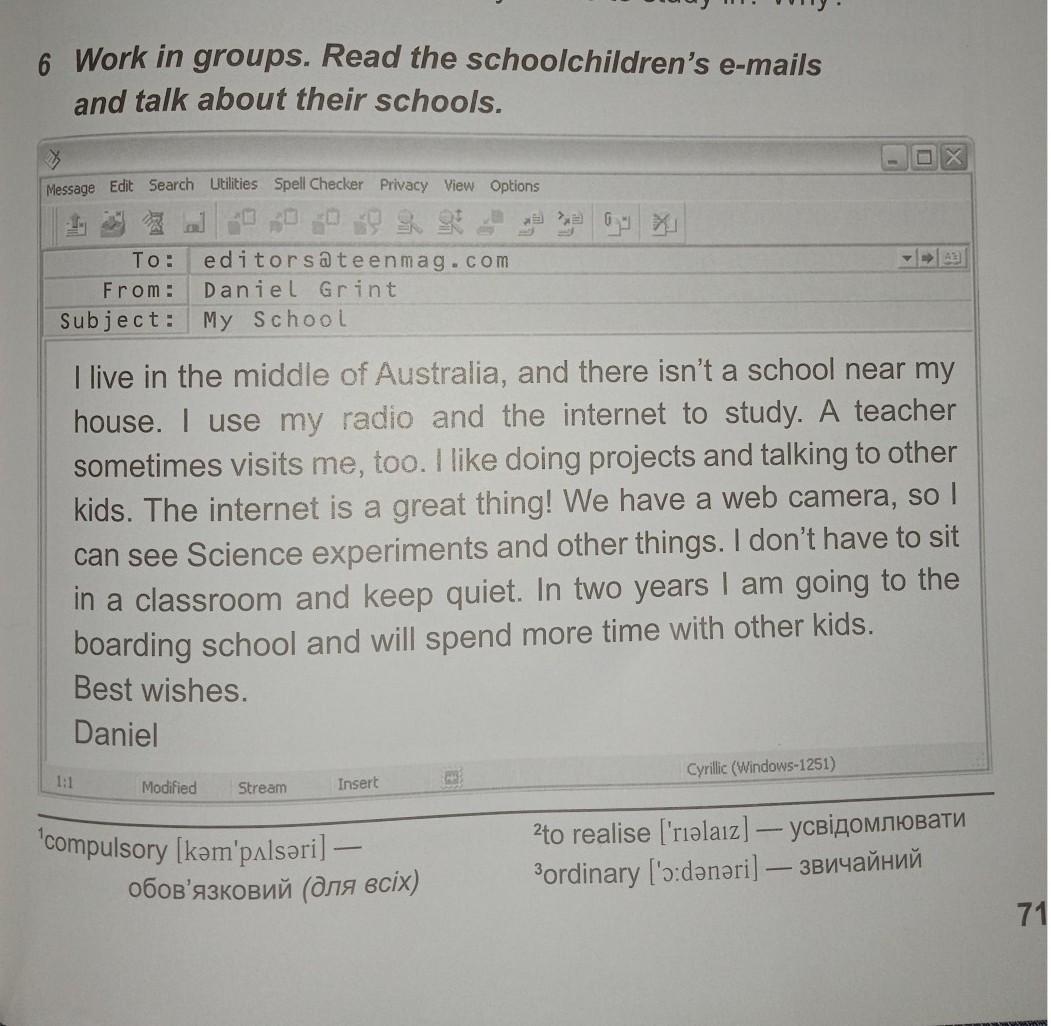 6. Work in groups. Read the schoolchildren's e-mails and talk about their schools. (розказати про їхні школи).