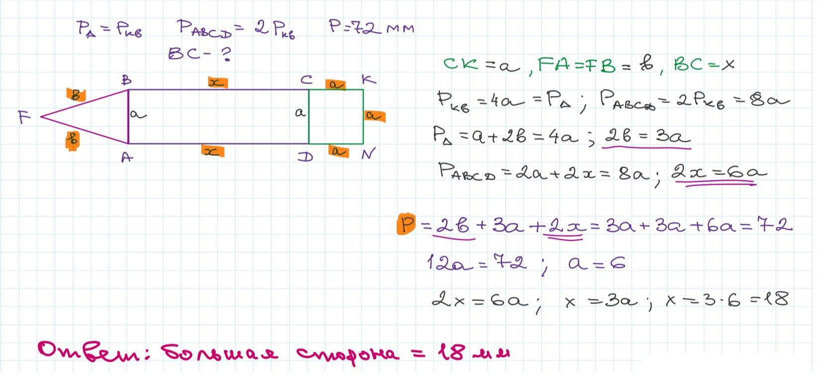 Для того, чтобы нарисовать карандаш с ластиком, Саша нарисовал квадрат, к нему присоединил прямоугольник той же ширины, и затем равнобедренный треугольник, с основанием которого совпадает с одной из сторон прямоугольника (рисунок). Периметр всей фигуры составил 72мм, причём у квадрата и треугольника периметры равны, а у прямоугольника периметр в два раза больше. Найдите большую сторону прямоугольника