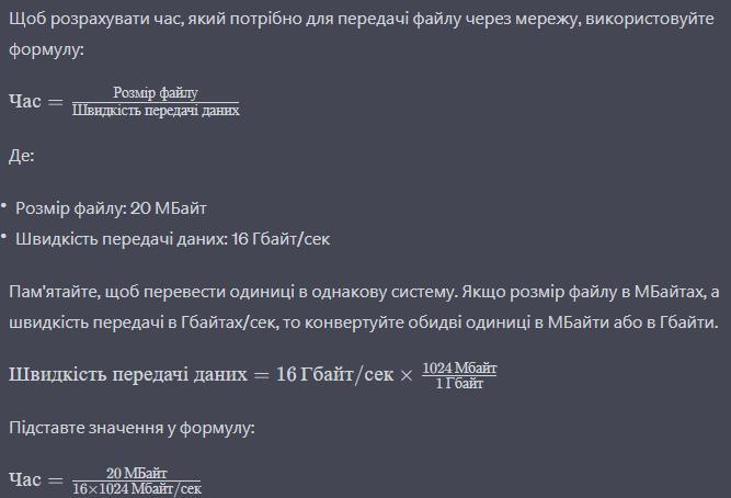 скільки часу потрібно для переведення мультимідійного файлу розміром 20Мбайт мережою с пропускною можливістю 16 Гбайт/сек?