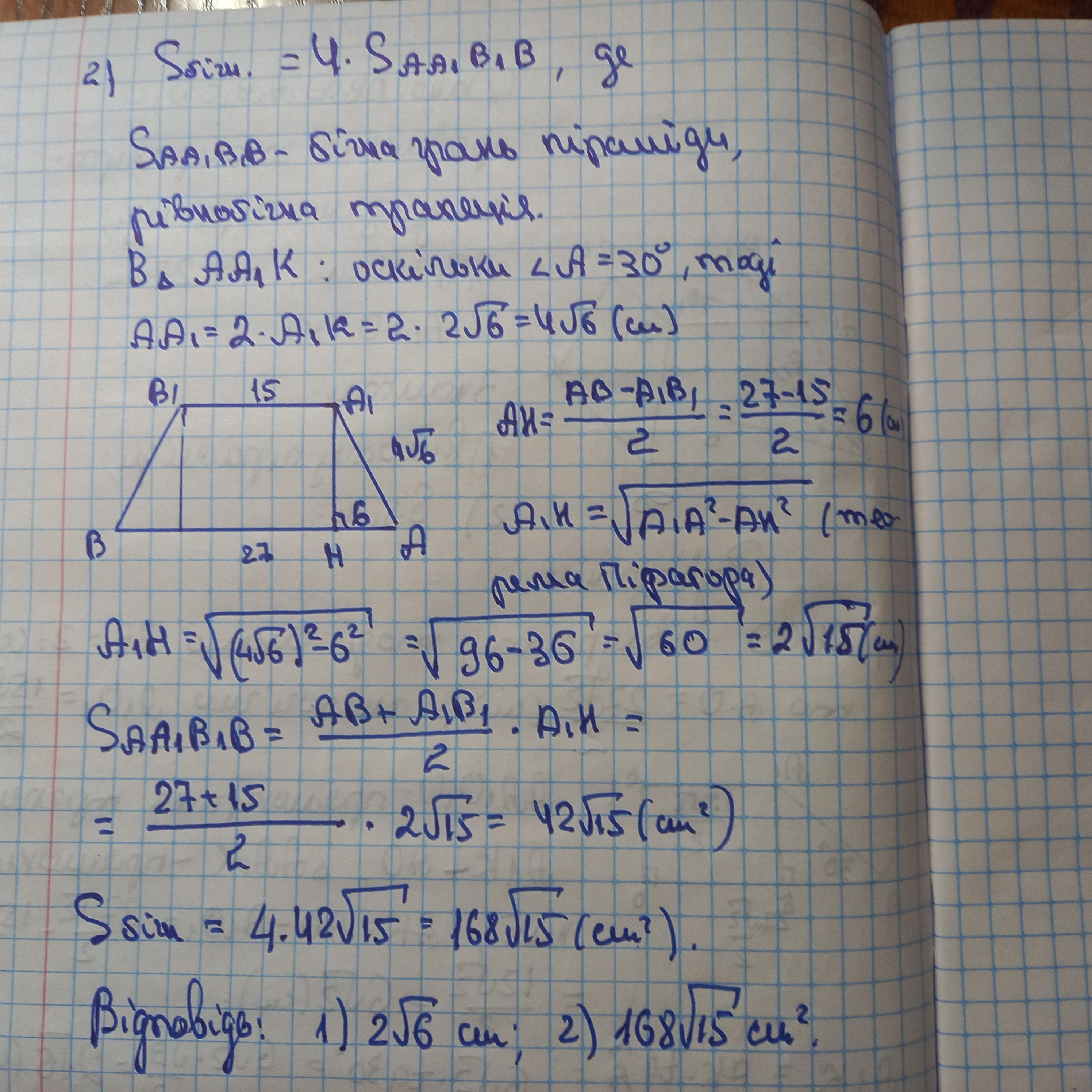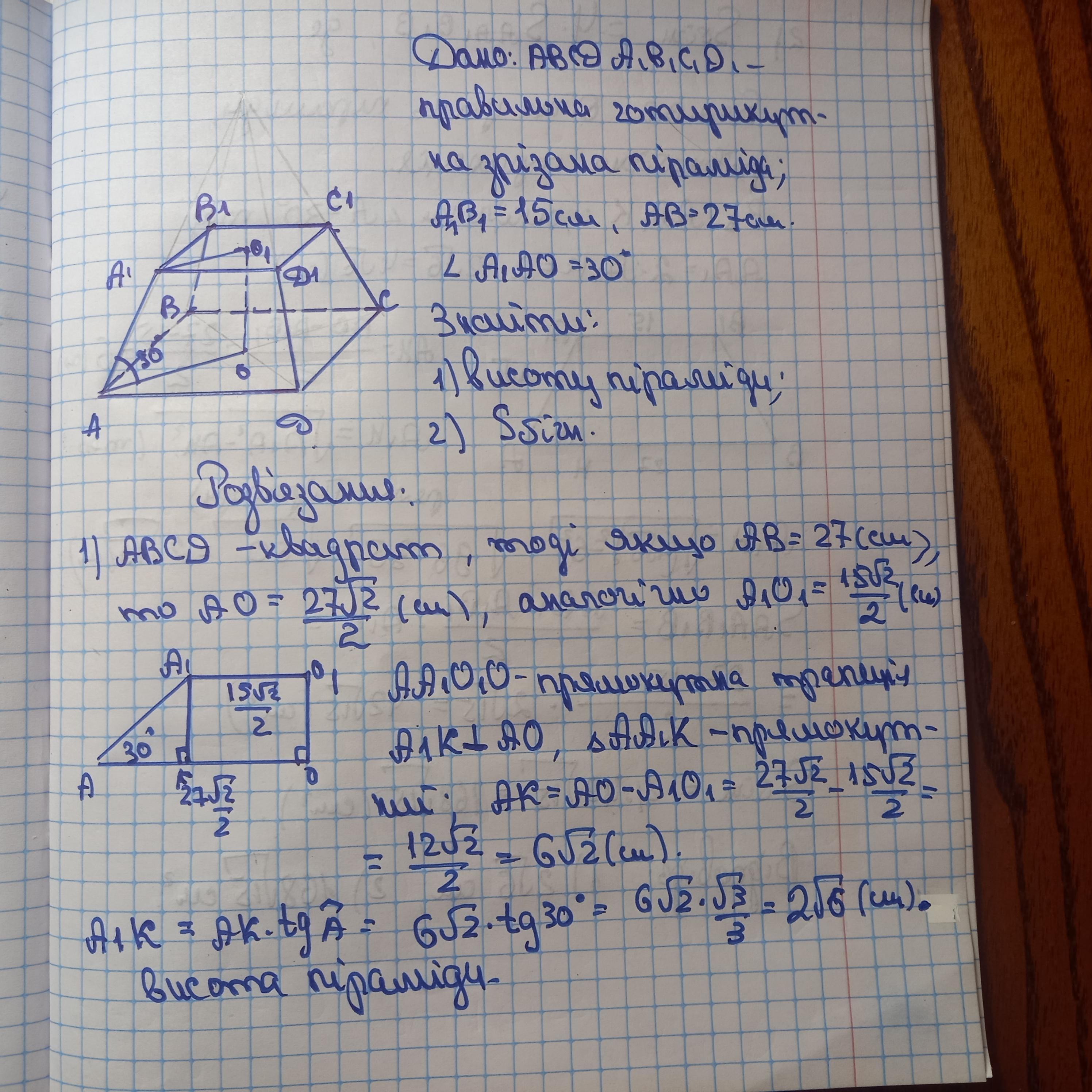 Сторони основ правильної чотирикутної зрізаної піраміди дорівнюють 15 см і 27 см, а бічне ребро утворює з площиною більшої основи кут 30°. Знайдіть: