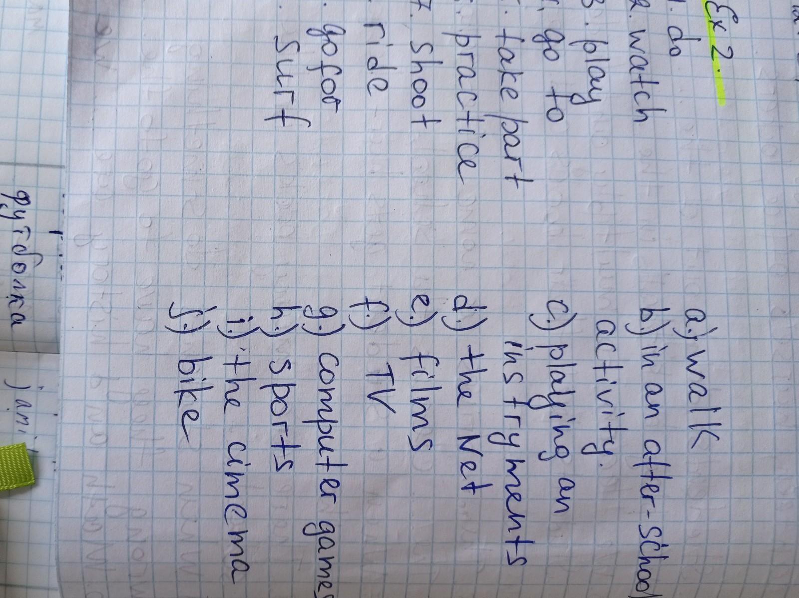 Відповідь: shoot films, ride bike, go to the cinema,surf the Net, do sports,watch TV,play computer game, take part in on after school activity, practice playing on instruments, go for walk