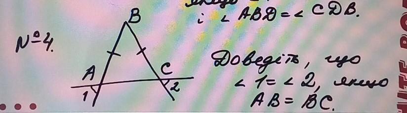 Так как AB=BC, тогда треугольник ABC - равндобедренный. У равнобедренного треугольника углы при основании равны, т. е. угол A=C. Угол 1 и А - вертикальные. По свойству вертикальных углов А=1, тогда и C=2. А так как A=C, то и 1=2