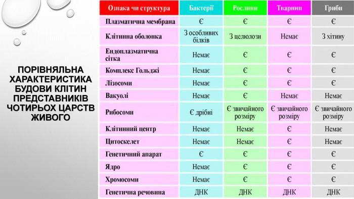 4. ЗАПОВНІТЬ ТАБЛИЦЮ. " ПОРІВНЯЛЬНА ХАРАКТЕРИСТИКА КЛІТИН БАКТЕРІЙ, РОСЛИН І ТВАРИН " Бактерії Рослини Сорганели КЛІТИН 1. Клітинна стінка 2. Цитоплазма 3. Ядро 4. Вакуолі 5. ЕПС 6. Комплекс Гольджі 7. Мітохондрії 8. Рибосоми 9. Пластиди 10. Лізосоми Тварини