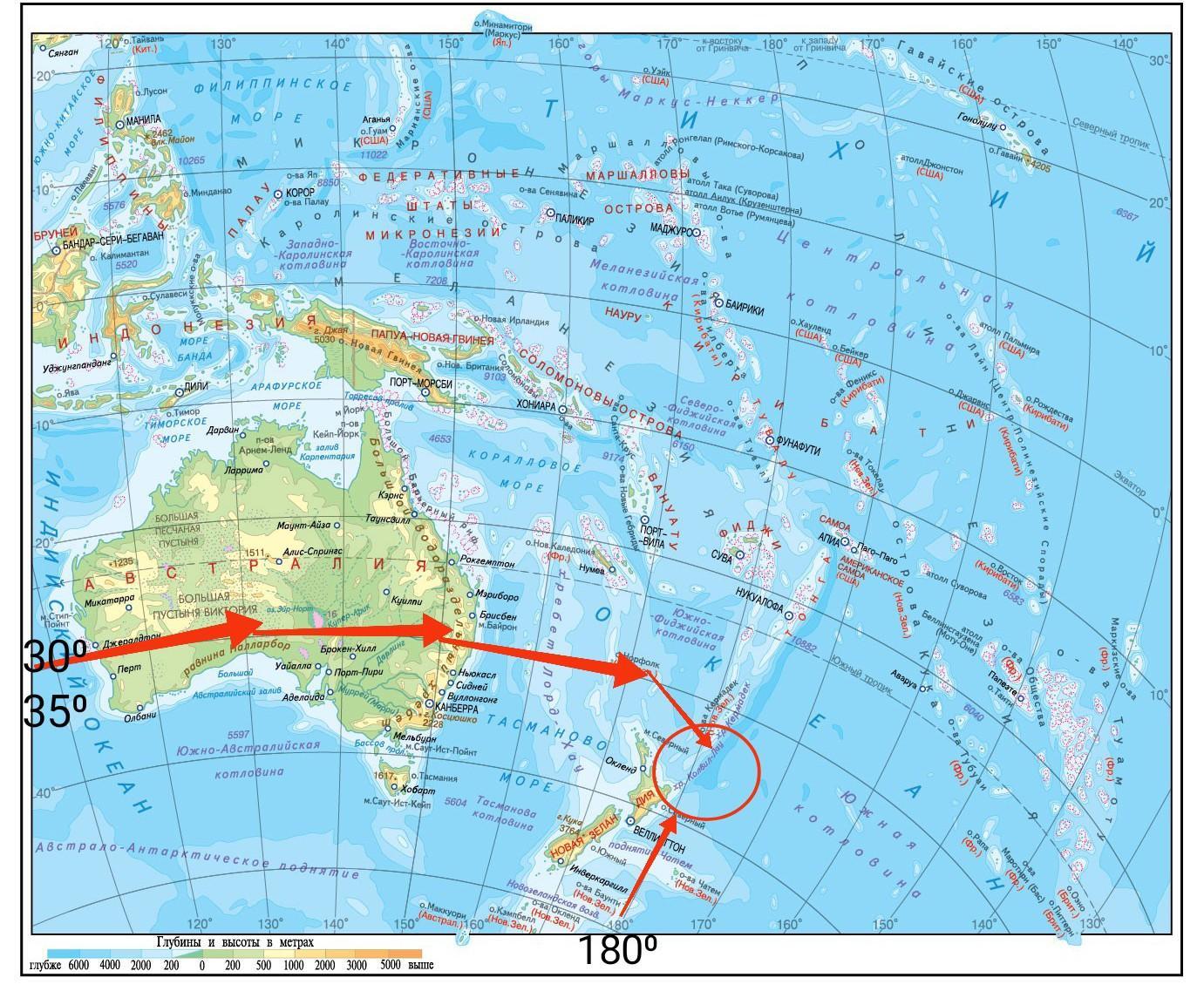 определить географические координаты, 35⁰ ю. ш., 180⁰ в. д.