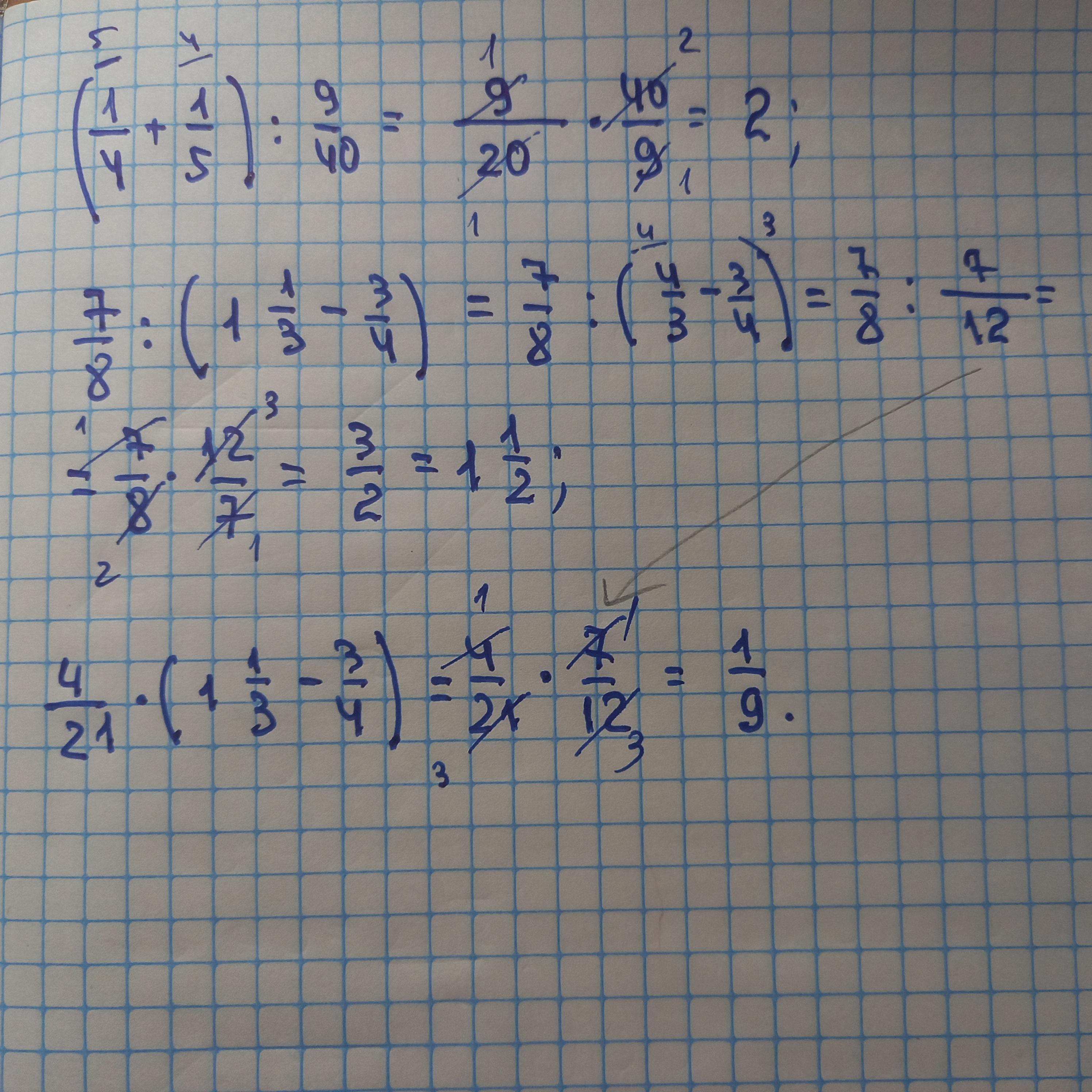 обчисли (1/4+1/5):9/40; 7/8:(1 1/3-3/4); 4/21*(1 1/3-3/4);