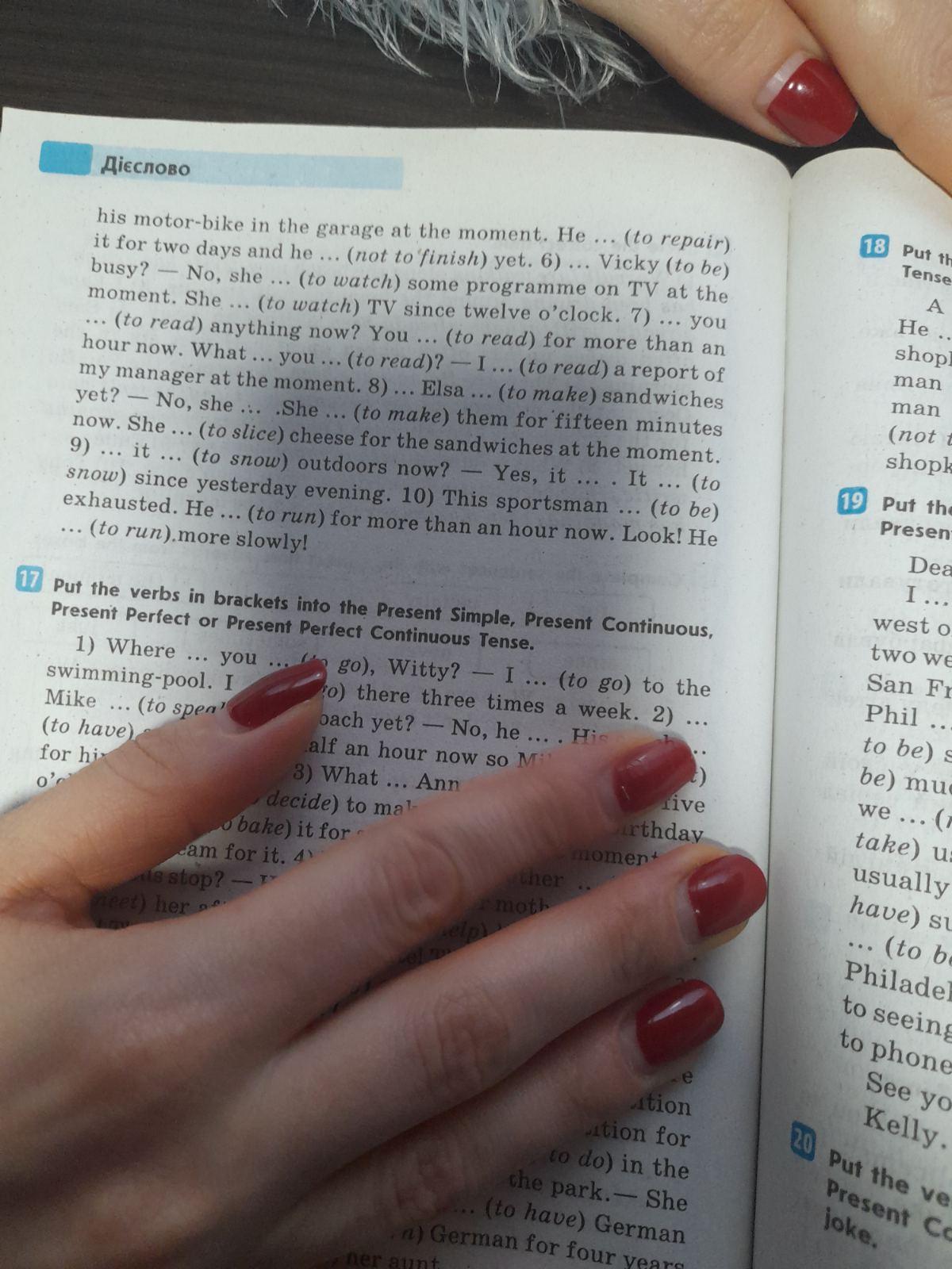 7) Are you **reading** anything now? You **have been reading** for more than an hour now. What **are** you **reading**? - I **am reading** a report of my manager at the moment.