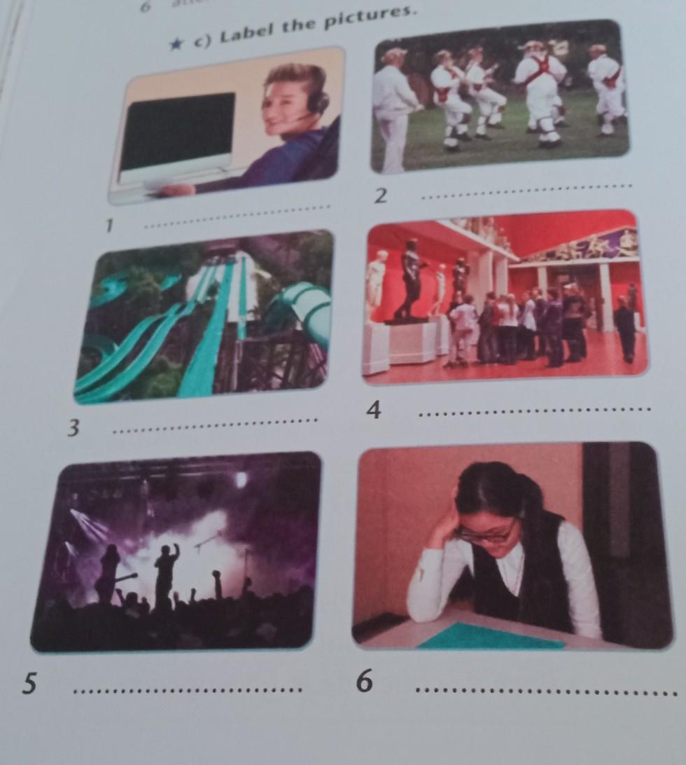 1computer addiction 2.Folk dances 3. Long waterfalls 4.famous sculptures5.Rock concert 6. Boring study
