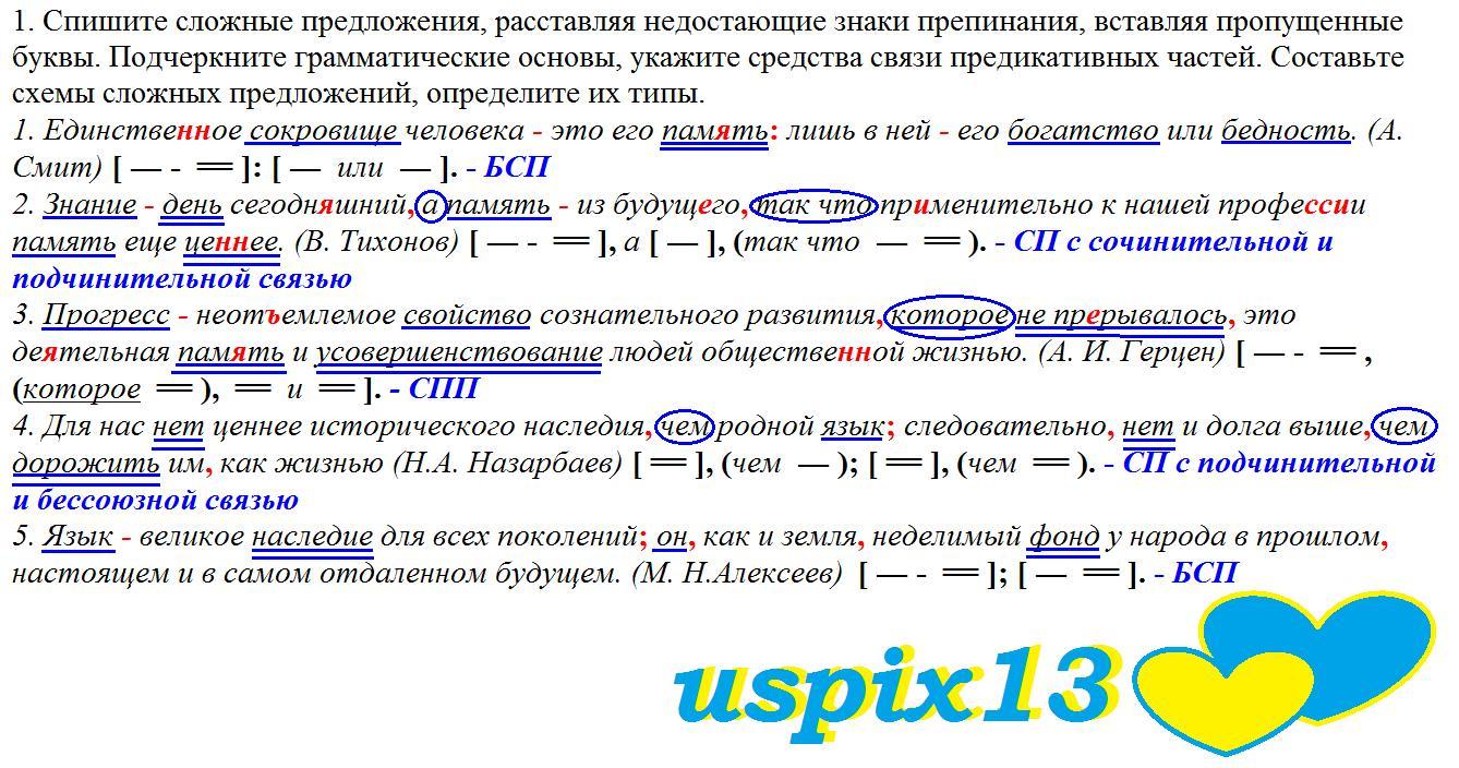 1. Спишите сложные предложения, расставляя недостающие знаки препинания, вставляя пропущенные буквы. Подчеркните грамматические основы, укажите сред- ства связи предикативных частей. Составьте схемы сложных предложений, опреде- лите их типы. 1. Единстве...ое сокровище человека это его пам...ть лишь в ней его бо- гатство или бедность. (А. Смим) 2. Знание день сегодн...шний а память из будущ...го так что пр...менительно к нашей профе...ни память еще це...ее. (В. Тихонов) 3. Прогресс неот...емлемое свойство сознательного развития, которое не пр...рывалось это де...тельная пам...ть и усовершен- ствование людей обществе...ой жизнью. (А. И. Герцен) 4. Для нас нет цен- нее исторического наследия чем родной язык следовательно нет и долга выше чем дорожить им как жизнью (Н.А. Назарбаев) 5. Язык великое наследие для всех поколений он как и земля неделимый фонд у народа в прошлом настоящем и в самом отдаленном будущем. (М. Н.Алексеев)