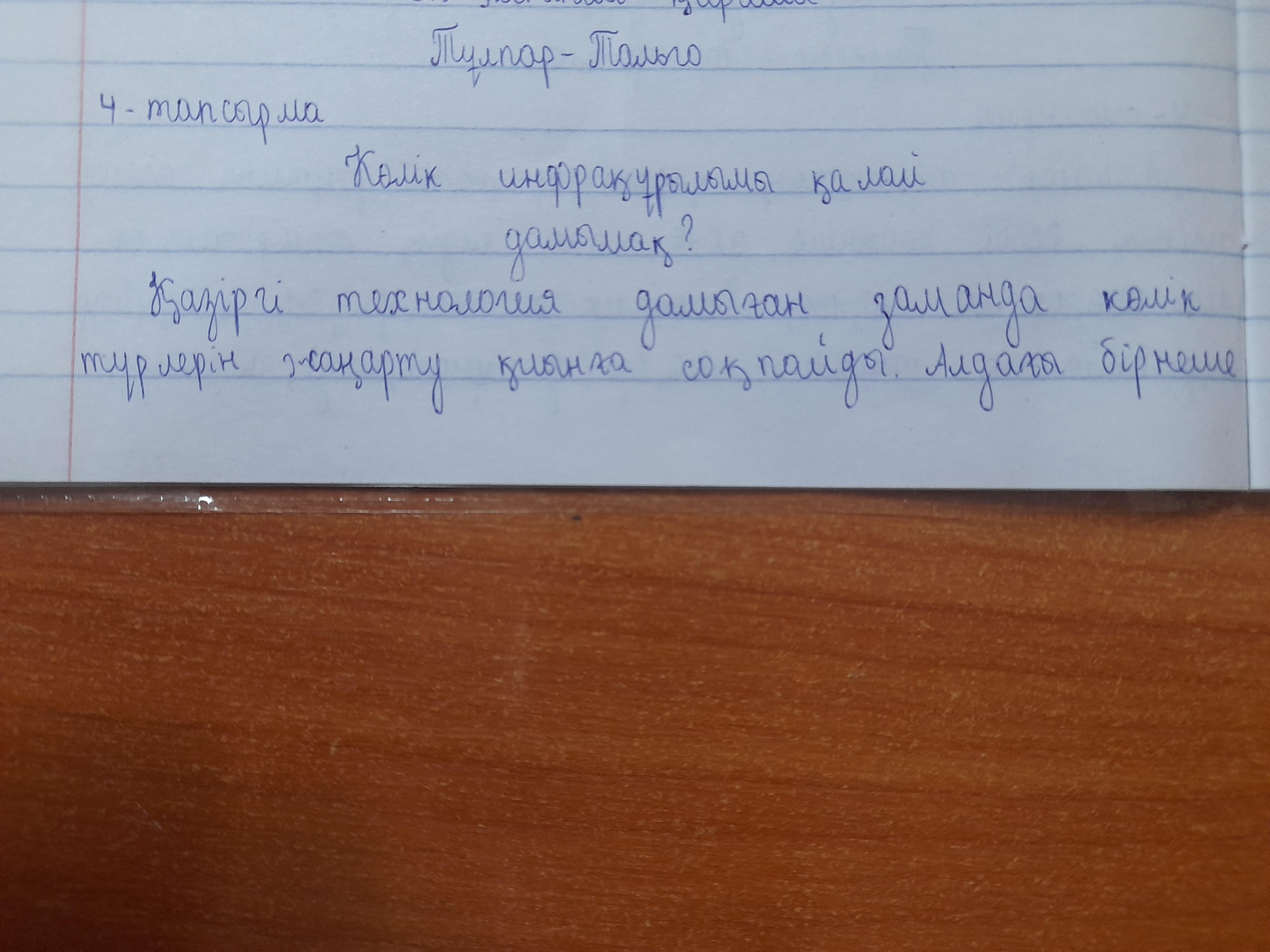 4. Графиктік мәтіндегі деректерді салыстырып, маңызды тустары мен үрдістерді талдап, «Көлік инфрақұрылымы қалай тақырыбына мәтін жазыңдар. Заманауи көлік-логистика жүйесін қалыптастыру Трансконтиненталды дәлiздiң мүмкіндіктерін пайдалану Жук козғалысын онлайн режімде бақылау Цифрлық технологияның игілігін пайдалану Экономикалық-әлеуметтік тұрмысты жақсарту