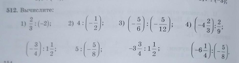 512. Вычислите: 1) 3:(-2); 3 4 4:( 2 ): 2) 4: 5: 3) 6 5 12 1 3 -3-:1 ; 4 2 4) | -4 2 3 9