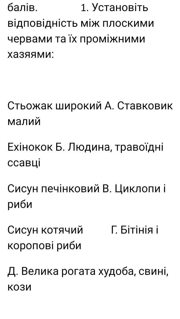 Кожна правильна позиція −0,5 балів. 1. Установіть між плоскими відповідність червами та їх проміжними хазяями: Стьожак широкий А. Ставковик малий Ехінокок Б. Людина, травоїдні ссавці Сисун печінковий В. Циклопи і риби Сисун котячий короповi риби Г. Бітінія і Д. Велика рогата худоба, свині, кози