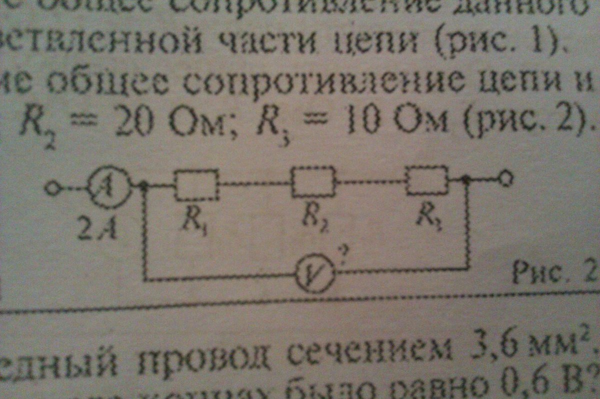 Определить по данной схеме общее сопротивление цнпи и показание вольтметра R1 = 10Ом R2 = 20Ом R3 = 10Ом
