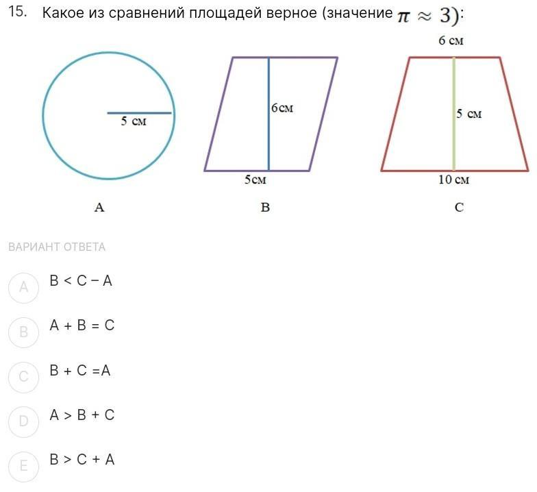 15. Какое из сравнений площадей верное (значение п≈ 3): 6 см 6см OFF 5cm B A 5 см 5 см 10 см с
