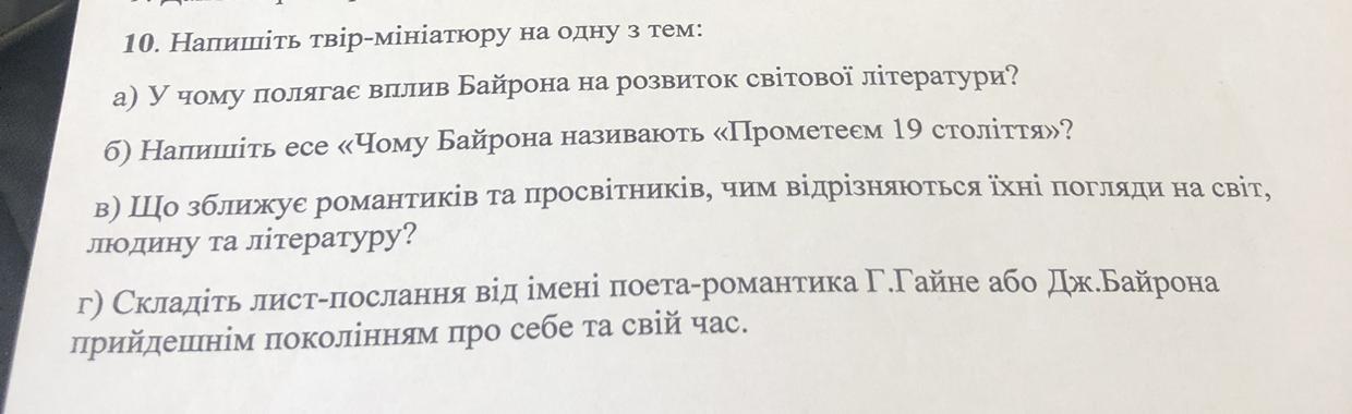 а) Вплив лорда Байрона на розвиток світової літератури був визначальним і залишив глибокий слід в історії словесності. Байрон, англійський поет і письменник романтичного періоду, проживав у XIX столітті і відомий своєю неординарністю, складністю створених образів та поєднанням романтизму з трагедією.