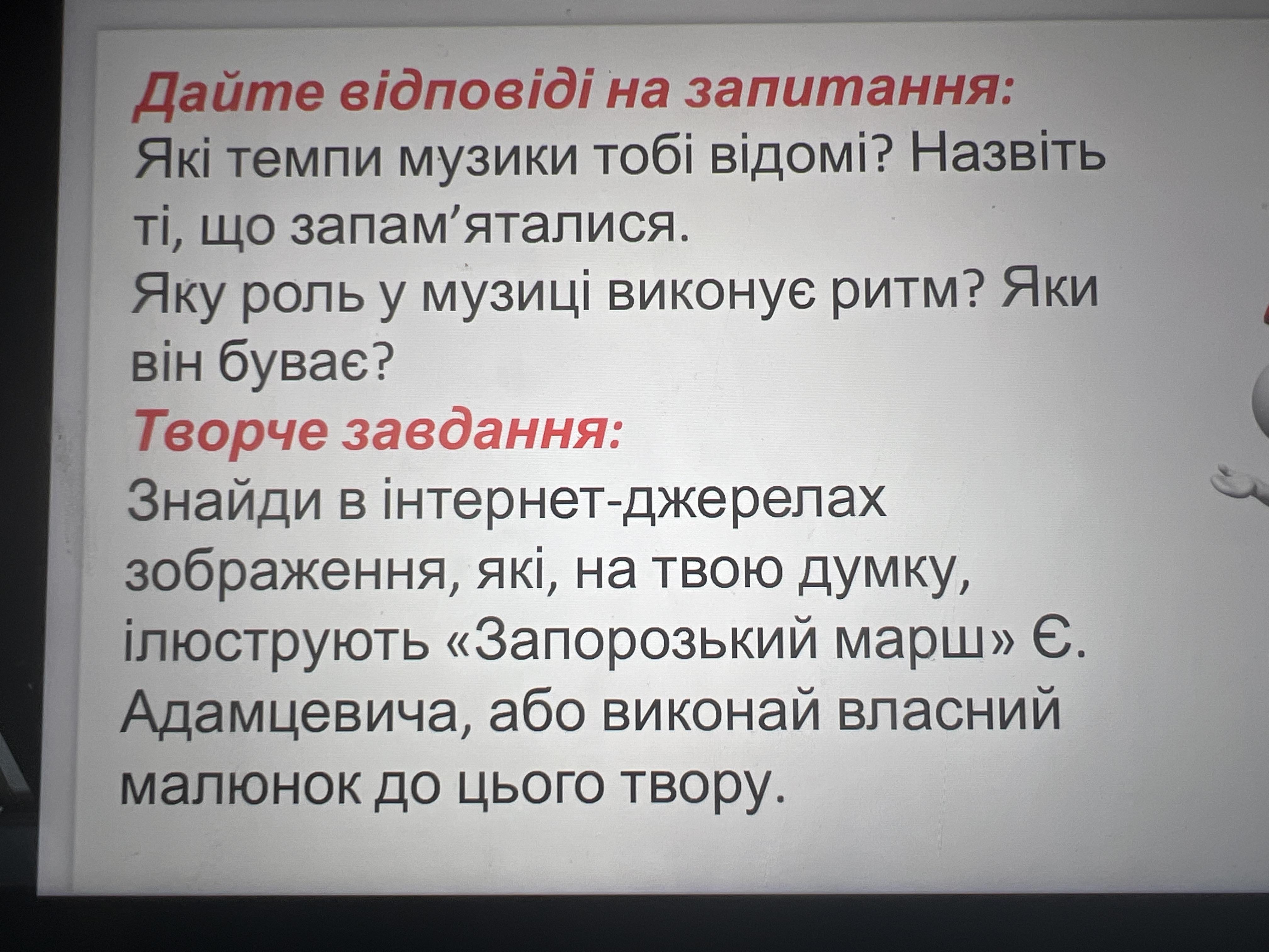 Які темпи тобі відомі? - граве, лярго/ларго, адажио, ленто (медленные темпы); анданте, модерато (средние темпы); анимато, аллегро, виво, престо (быстрые темпы)