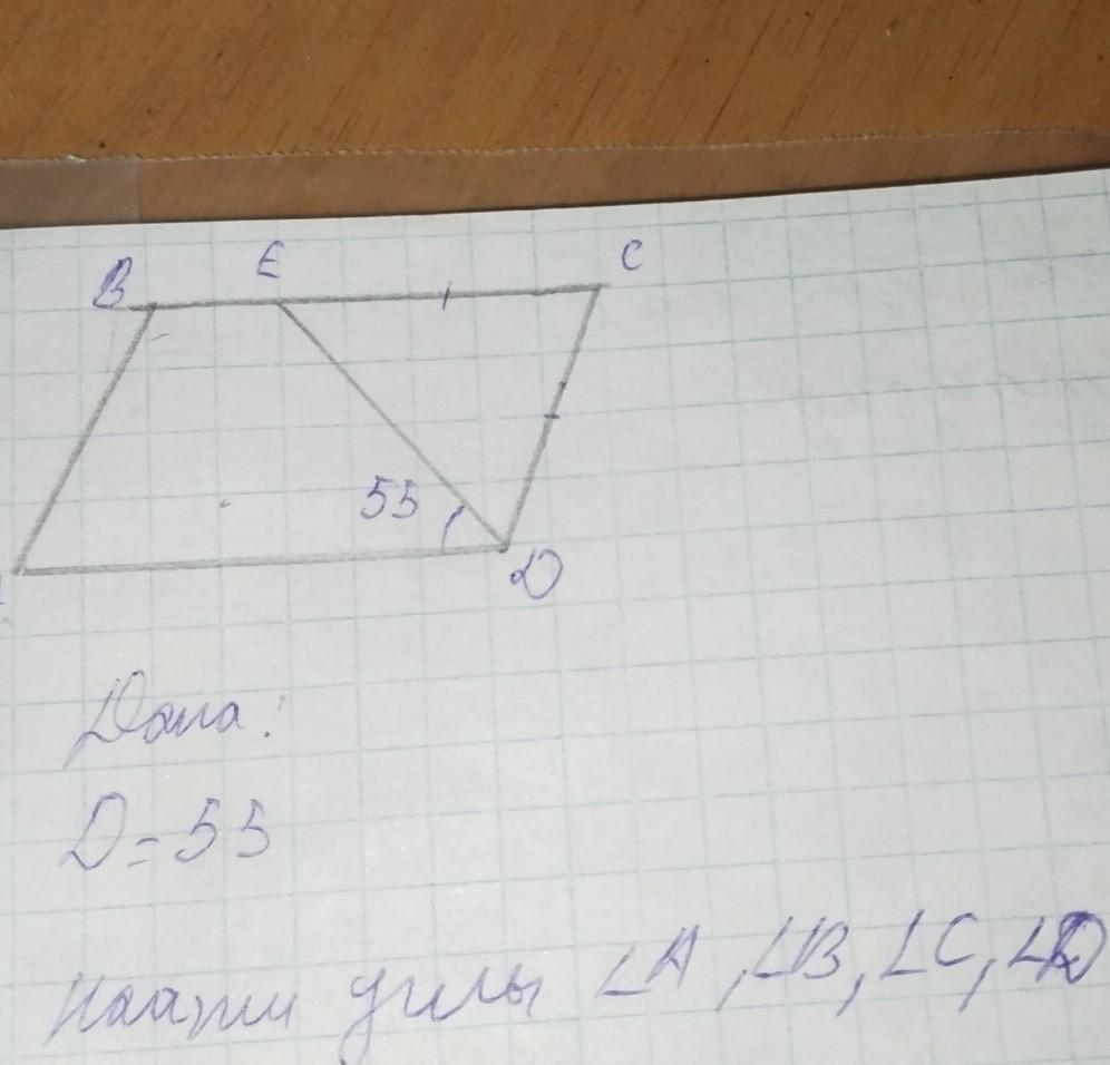 кут BAD = кут ECD = кут BCD = 180° - кут EDC - кут DEC = 180° - 55° - 55° = 180° - 110° = 70° - за ознакою суми кутів трикутників