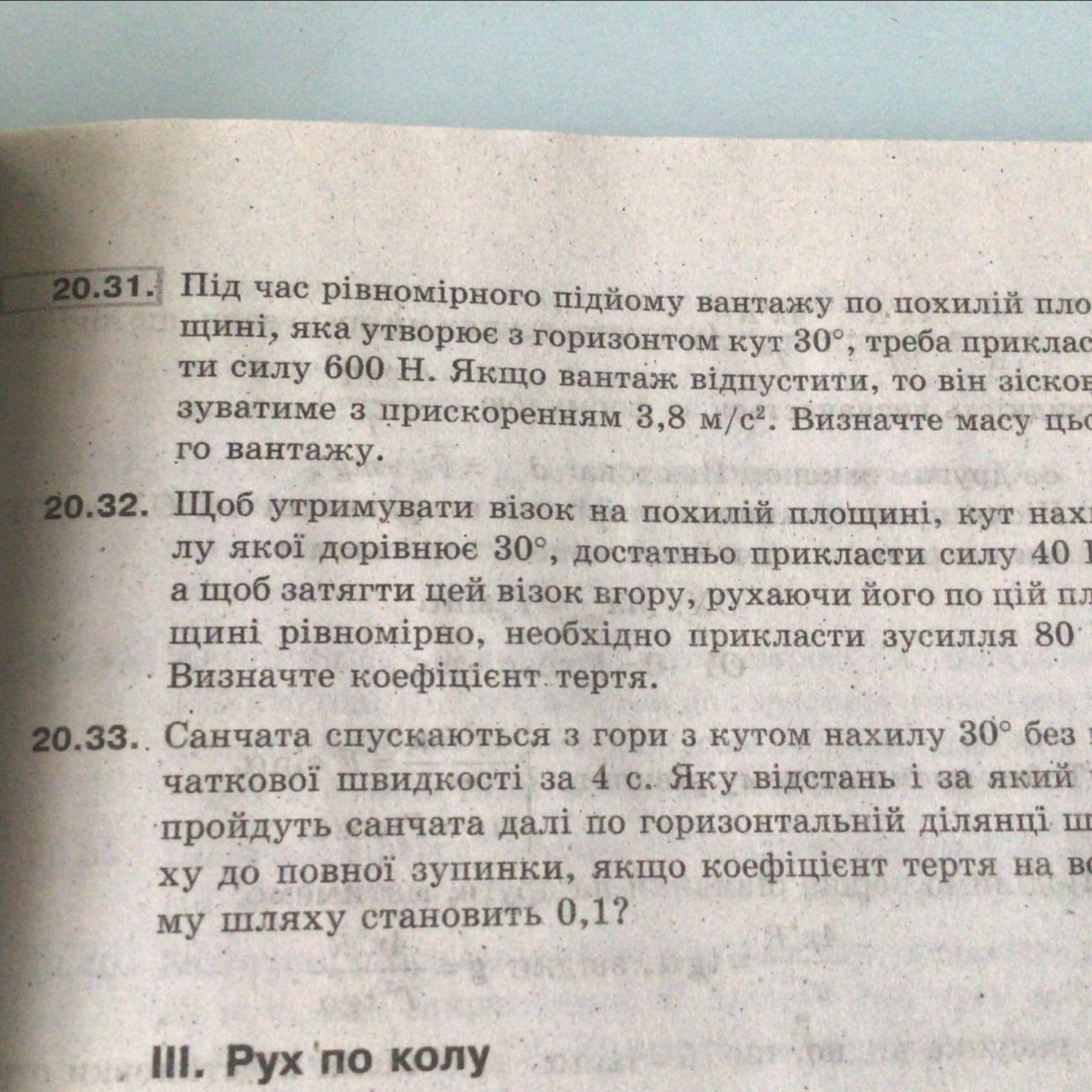 Щоб утримувати візок на похилій площині, кут нахи-лу якої дорівнює 30°, достатньо прикласти силу 40 Н, а щоб затягти цей візок вгору, рухаючи його по цій пло-щині рівномірно, необхідно прикласти зусилля 80 н. Визначте коефіцієнт тертя.