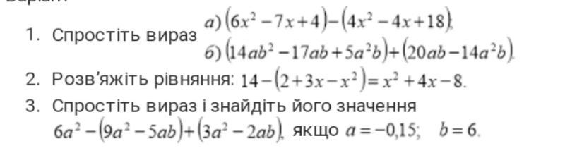 6a²-(9a²-5ab)+(3a²-2ab) = (первым делом, мы открываем скобочки. т. к. у нас умножение нет, то что стоит перед скобочками, то и раскрываем. К примеру у нас -(9a²-5ab), мы его раскрываем с противоположными знаками, т. к. у нас стоит минус. Выходит минус на плюс даёт минус, минус на минус даёт плюс.) = 6a² - 9a²+5ab + 3a²-2ab = (Дальше всё тоже просто. находим подобные и делаем действия.) = 6a² -9a²+5ab + 3a²-2ab = (6a² -9a² и + 3a² у нас сокращаються, 5ab-2ab) = 3ab. Вот и ответ :)