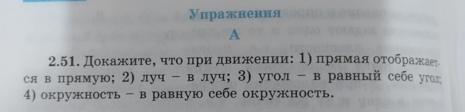 2.51. Докажите, что при движении: 1) прямая отображает ся в прямую; 2) луч - в луч; 3) угол - в равный себе угол; 4) окружность - в равную себе окружность.