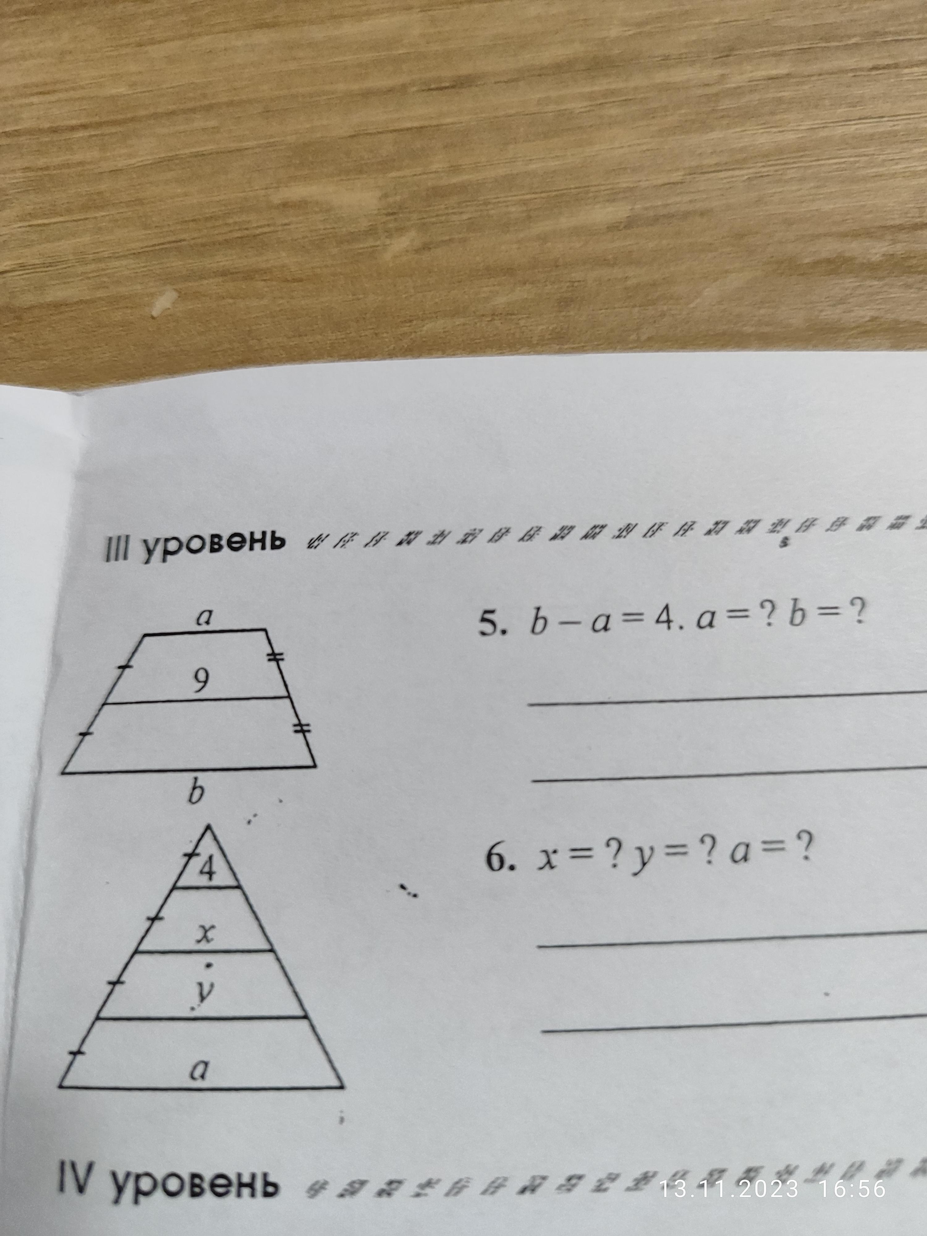 5) это средняя так как линия делить ровно по середине обе стороны значит что это средняя линия. По свойстве средней линии мы знаем что она равна 1/2 стороне. По рисунку мы видим что средняя линия равна 1/2 стороне b значит b=18 с уровнем 18-a=4 мы можем решить что а=14