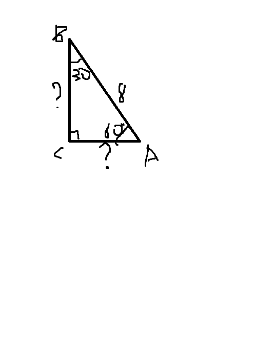 CA=4, т.к катет напротив угла в 30 градусов равен половине гипотенузы; CB=3*sqrt3 (четыре корня из трех), по опеделению синуса угла (отношение противолежащего угла к гипотенузе)
