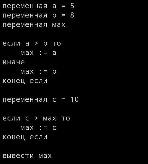 Этот код сначала сравнивает `a` и `b`, и большее из них присваивается переменной `мах`. Затем сравнивается значение `мах` с числом `c`, и если `c` больше, оно присваивается `мах`. В конце выводится значение `мах`.