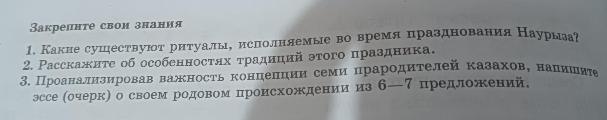 Закрепите свои знания 1. Какие существуют ритуалы, исполняемые во время празднования Наурыза? 2. Расскажите об особенностях традиций этого праздника. 3. Проанализировав важность концепции семи прародителей казахов, напишите эссе (очерк) о своем родовом происхождении из 6-7 предложений.