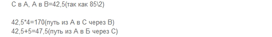 Города A,B и C расположены не на одной прямой. Путь из A в B через C на 5 км длиннее, чем прямой путь из A в B. Путь из A в C через B в 4 раза длиннее, чем прямой путь из A в С. Путь из B в C. через A равен 85 км. Найдите расстояние между каждыми городами. Пожаааааааалуйстааааааа