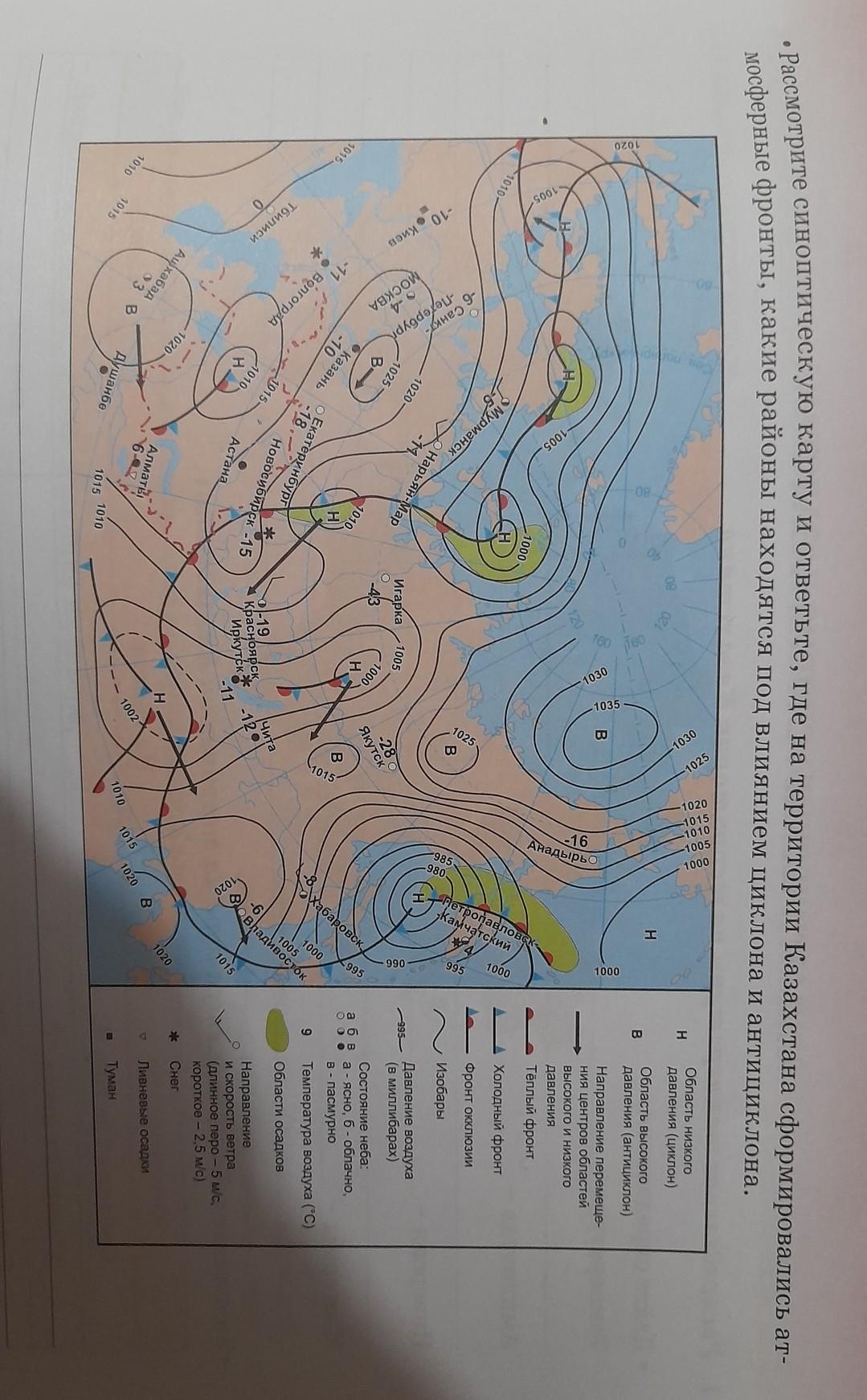помогите пожалуйста!!! Рассмотрите синоптическую карту и ответьте, где на территории Казахстана сформировалась атмосферные фронты, Какие районы находятся под влиянием циклона и антициклона