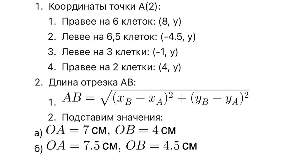 571. 1. Напишите координату точки, расположенной от точки A(2): 1) правее на 6 клеток; 2) левее на 6,5 клеток; 3) левее на 3 клетки; 4) правее на 2 клетки (за единичный отрезок принять одну клетку). 2. На одной прямой постройте отрезки ОА, ОВ. Найдите длину отрезка AB, если: 1) ОА = 7 см, ОВ = 4 см; 2) ОА = 7,5 см, = = ОВ = 4,5 см. = 119