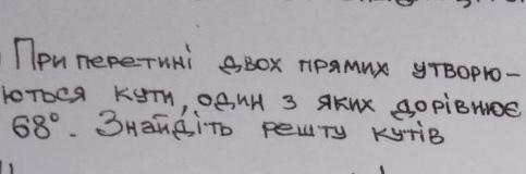 протилежні кути рівні, а сума сусідніх 180 , отже 180-68=112 , згачить кути 68 112 68 112