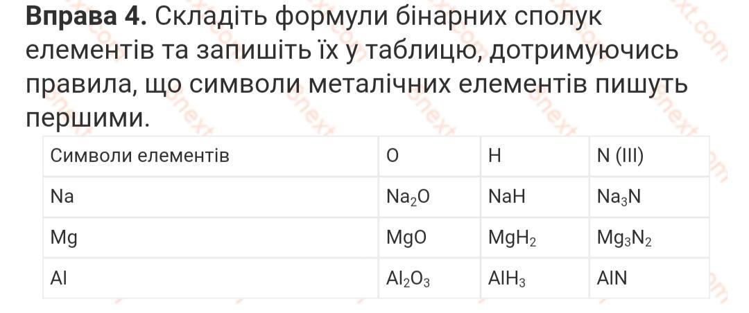 4. Складіть формули бінарних сполук елементів та запишіть їх у таб-