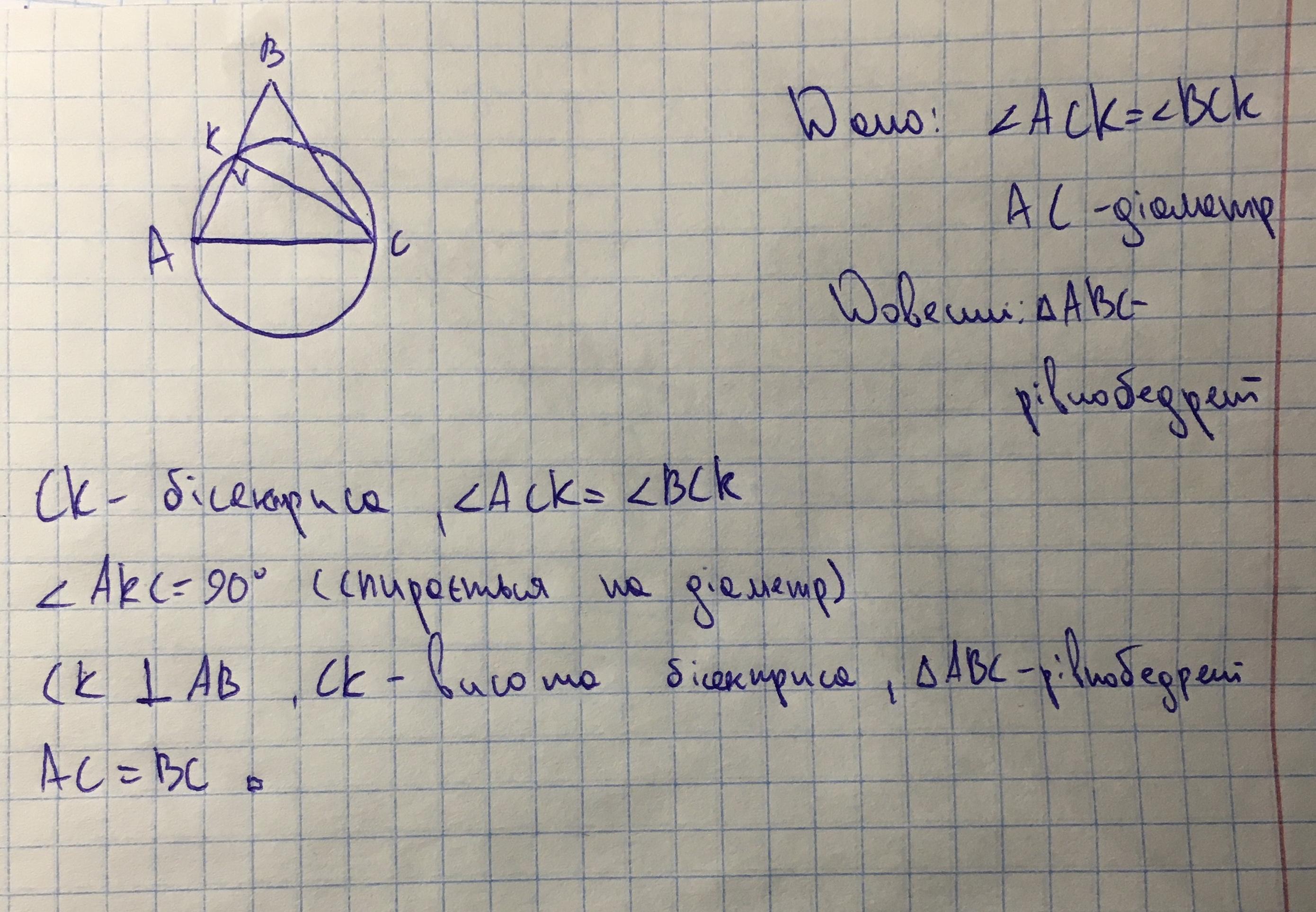 коло, побудоване на стороні АС трикутника АВС як на діаметрі, перетинає сторону АВ у точці К так, що АСК=ВСК. доведіть що трикутник АВС рівнобедрений.