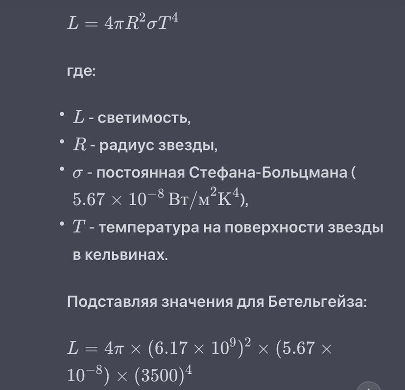 Рассчитайте это выражение для получения светимости Бетельгейза в ваттах.