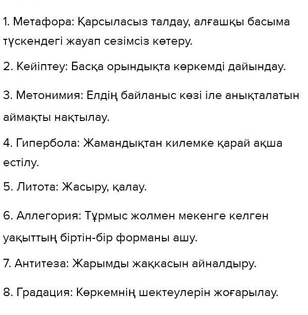 Метафора,кейіптеу,метономия,гипе рбола,литота,аллегория,антитеза,г радация,арнау,тұсбалдау осыларға мысалдар табу