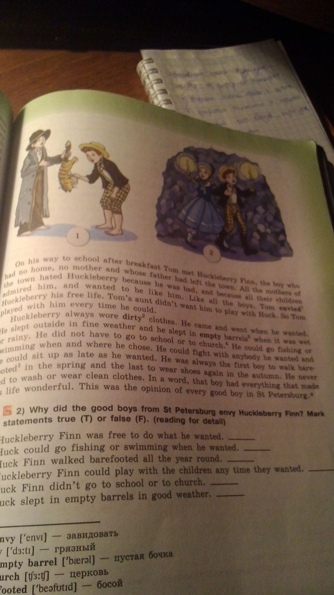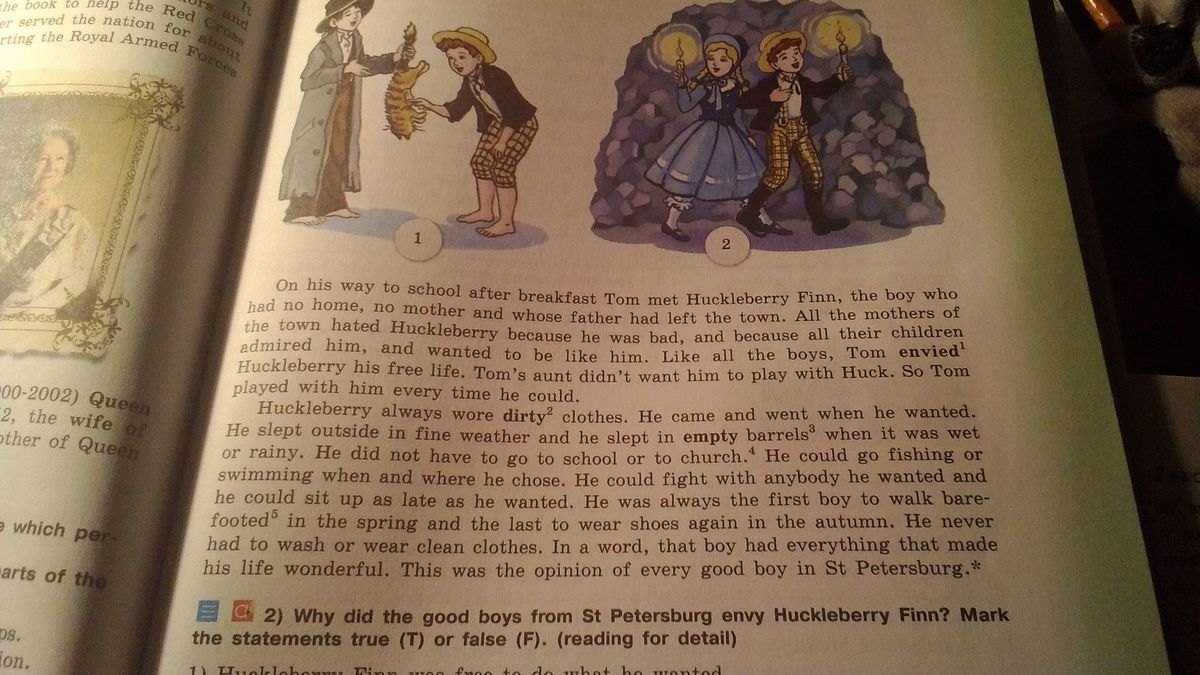 Гекльберри всегда носил грязную одежду, и приходил когда только хотел. В хорошую погоду он спал на улице под открытым небом, а в дождливую в пустых бочках.Ему не нужно было ходить в школу или в церковь.Он мог рыбачить или купаться тогда, когда он этого захочет. Мог драться с кем угодно и засиживаться до поздна, сколько влезет. Он был первым парнишкой , который ходил босиком начиная с весны, и одевал обувь лишь осенью .Ему не нужно было стирать и носить чистую одежду. К стати говоря, у этого мальчика было все, что делало его жизнь прекрасной. Таким было мнение каждого хорошего мальчика в Санкт Петербурге