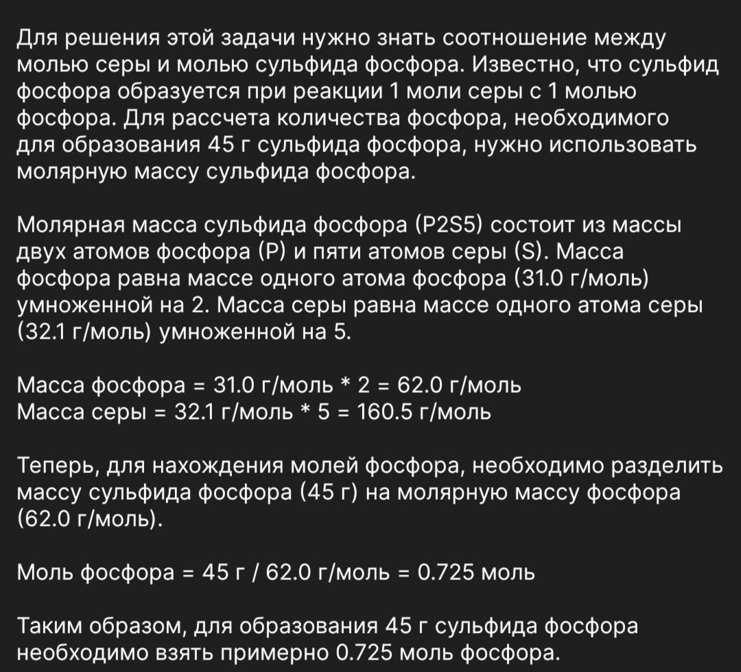 Для решения этой задачи нужно знать соотношение между молью серы и молью сульфида фосфора. Известно, что сульфид фосфора образуется при реакции 1 моли серы с 1 молью фосфора. Для рассчета количества фосфора, необходимого для образования 45 г сульфида фосфора, нужно использовать молярную массу сульфида фосфора.