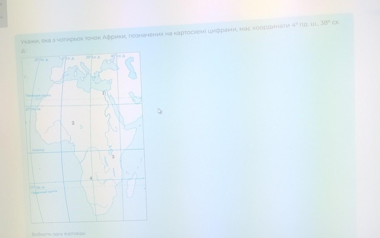 Укажи, яка з чотирьох точок Африки, позначених на картосхемі цифрами, має координати 4° пд. ш., 38° сх.д.
