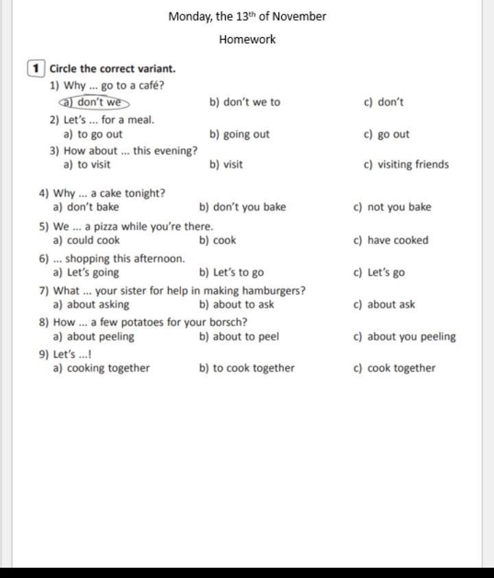 1 Circle the correct variant. 1) Why... go to a café? a) don't we 2) Let's... for a meal. a) to go out 3) How about... this evening? a) to visit 4) Why... a cake tonight? a) don't bake 6)... shopping this afternoon. a) Let's going b) don't we to 5) We... a pizza while you're there. a) could cook b) going out b) visit 9) Let's...! b) don't you bake a) cooking together b) Let's to go 7) What ... your sister for help in making hamburgers? a) about asking b) about to ask b) cook 8) How... a few potatoes for your borsch? a) about peeling b) about to peel b) to cook together c) don't c) go out c) visiting friends c) not you bake c) have cooked c) Let's go c) about ask c) about you peeling c) cook together