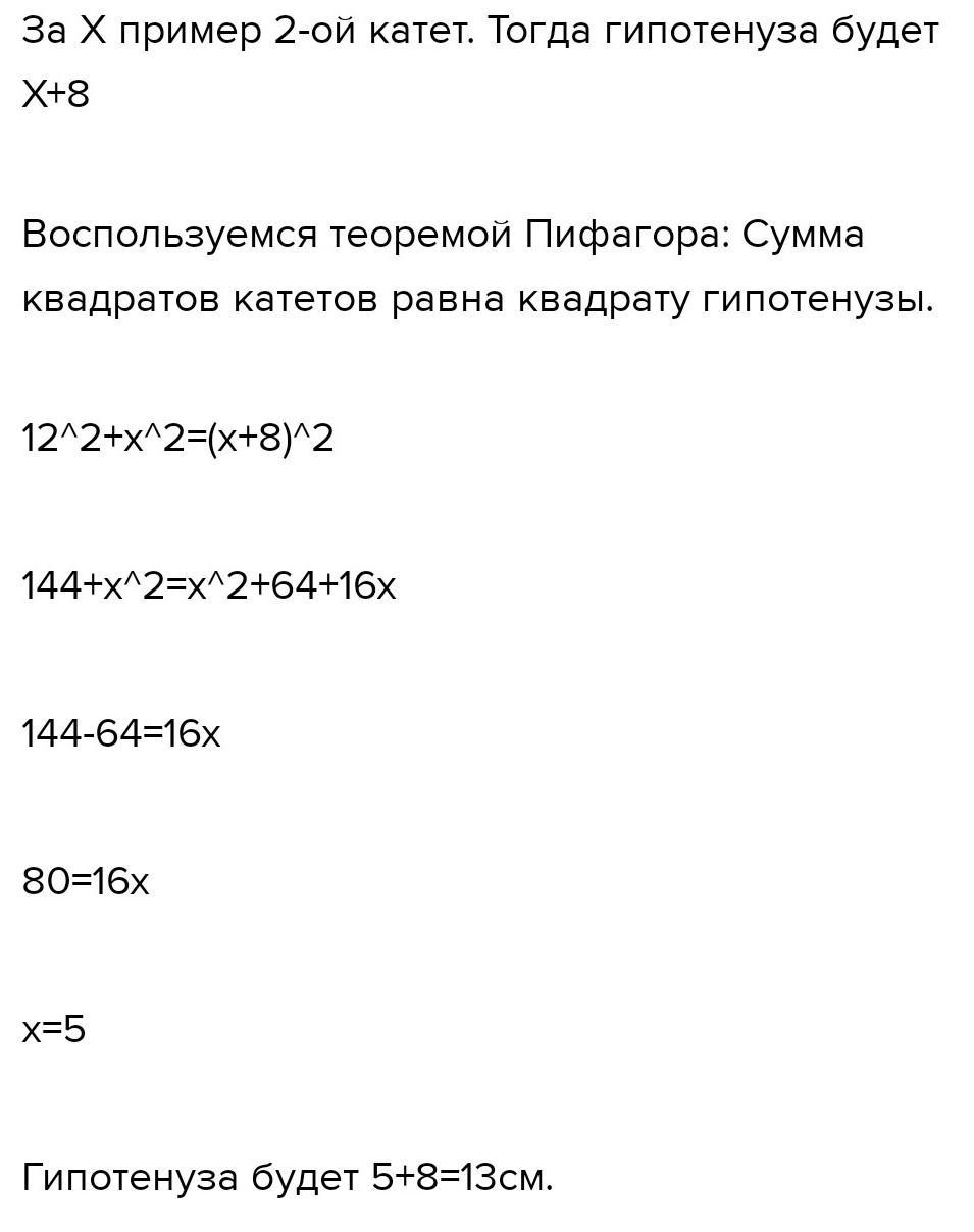 1. Один из катетов прямоугольного треугольника равен 12 см, а гипотенуза больше другого катета на 8 см.