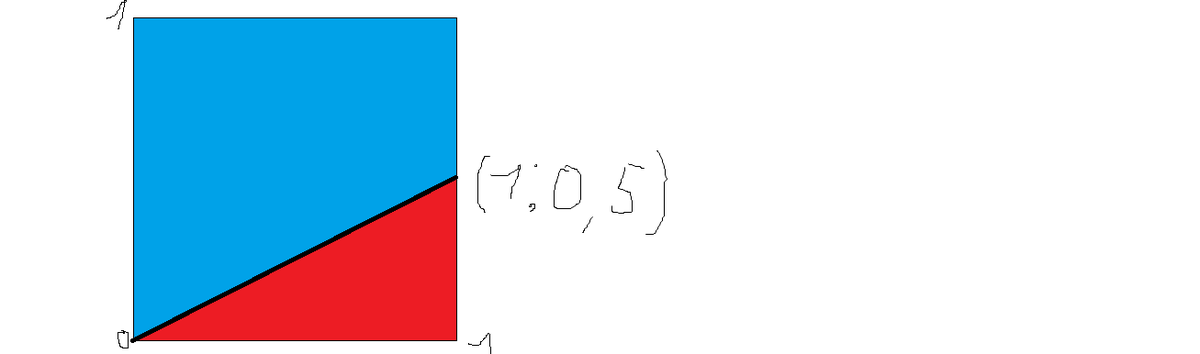 а вероятность = S(треугольника) / S(квадрата) = ((1*0,5)/2)/(1*1) = 0,25 = 25%