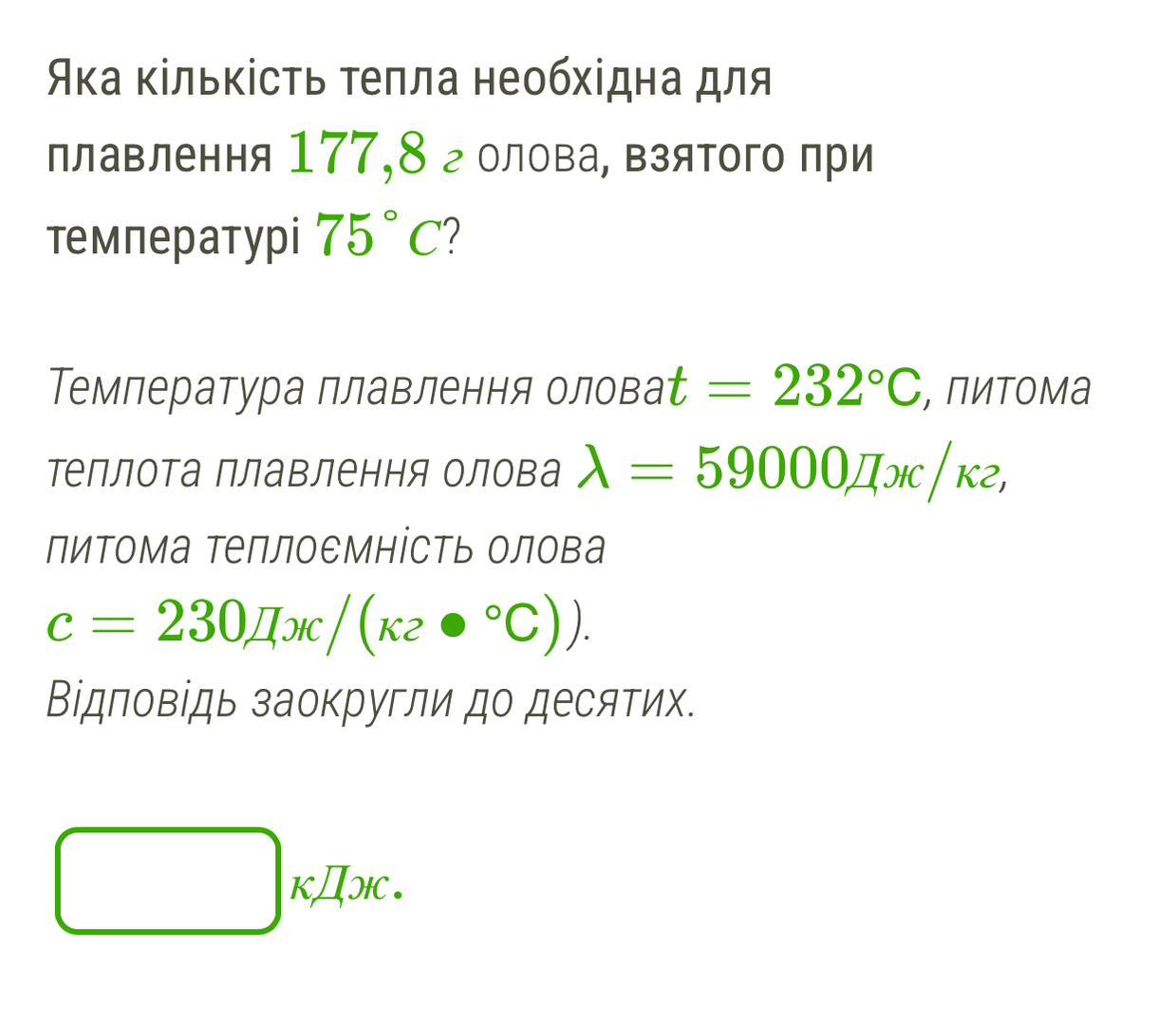 Температура плавлення оловаt=232℃, питома теплота плавлення олова λ=59000Дж/кг, питома теплоємність олова c=230Дж/(кг∙℃)).