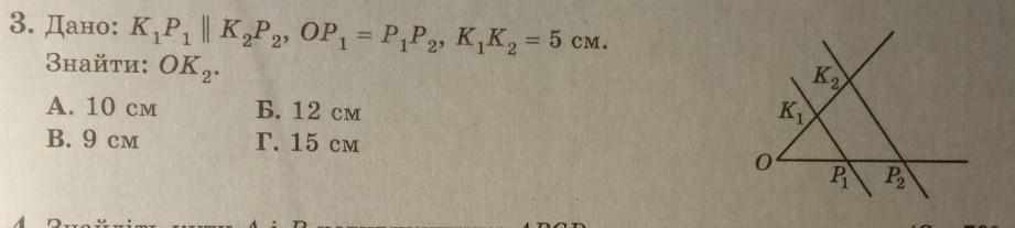 3. Дано: К.P1 || KP, OP1 = P.P2, K,K2 = 5 см. Знайти: ОК,. A. 10 см В. 9 см Б. 12 см Г. 15 см О K₁ K2 P₁ P₂ г