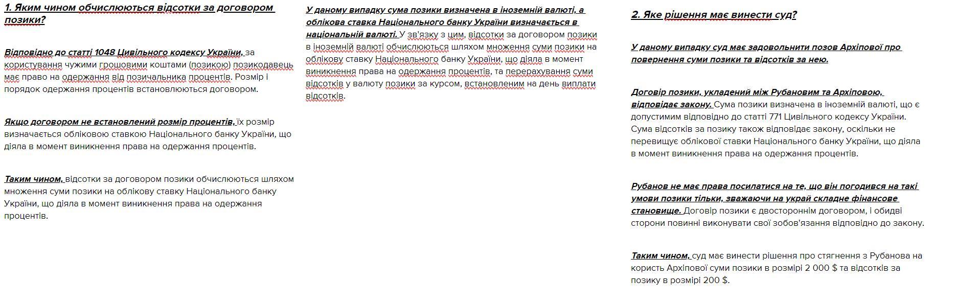 Громадянин Рубанов позичив у немолодої жінки Архіпової 2 000 $ на 6 місяців. Рубанов видав їй розписку, в якій окрім суми та дати повернення позики були зазначені відсотки за позику - 10 % від суми позики. У встановлений строк Рубанов ні суми позики, ні відсотків не повернув. Жінка звернулася до суду про повернення суми позики та відсотків за нею. В суді Рубанов заявив, що ця розписка не відповідає закону, оскільки сума позики визначена в іноземній валюті, а сума відсотків дуже зависока, і пояснив, що погодився на такі умови позики тільки, зважаючи на украй складне фінансове становище.